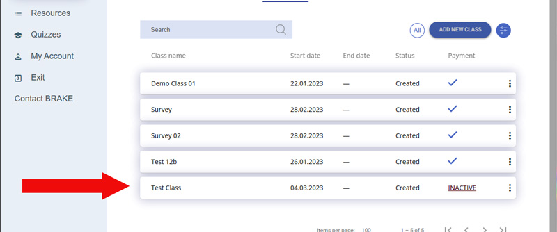 After creating a class, it will be added to the list of classes. It will be shown as "INACTIVE".