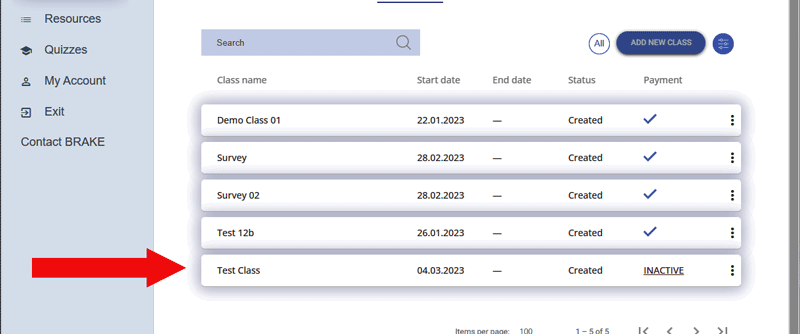 After creating a class and adding students to it, it will be added to the list of classes. However, it will be shown as "INACTIVE" until the class payment has been made.